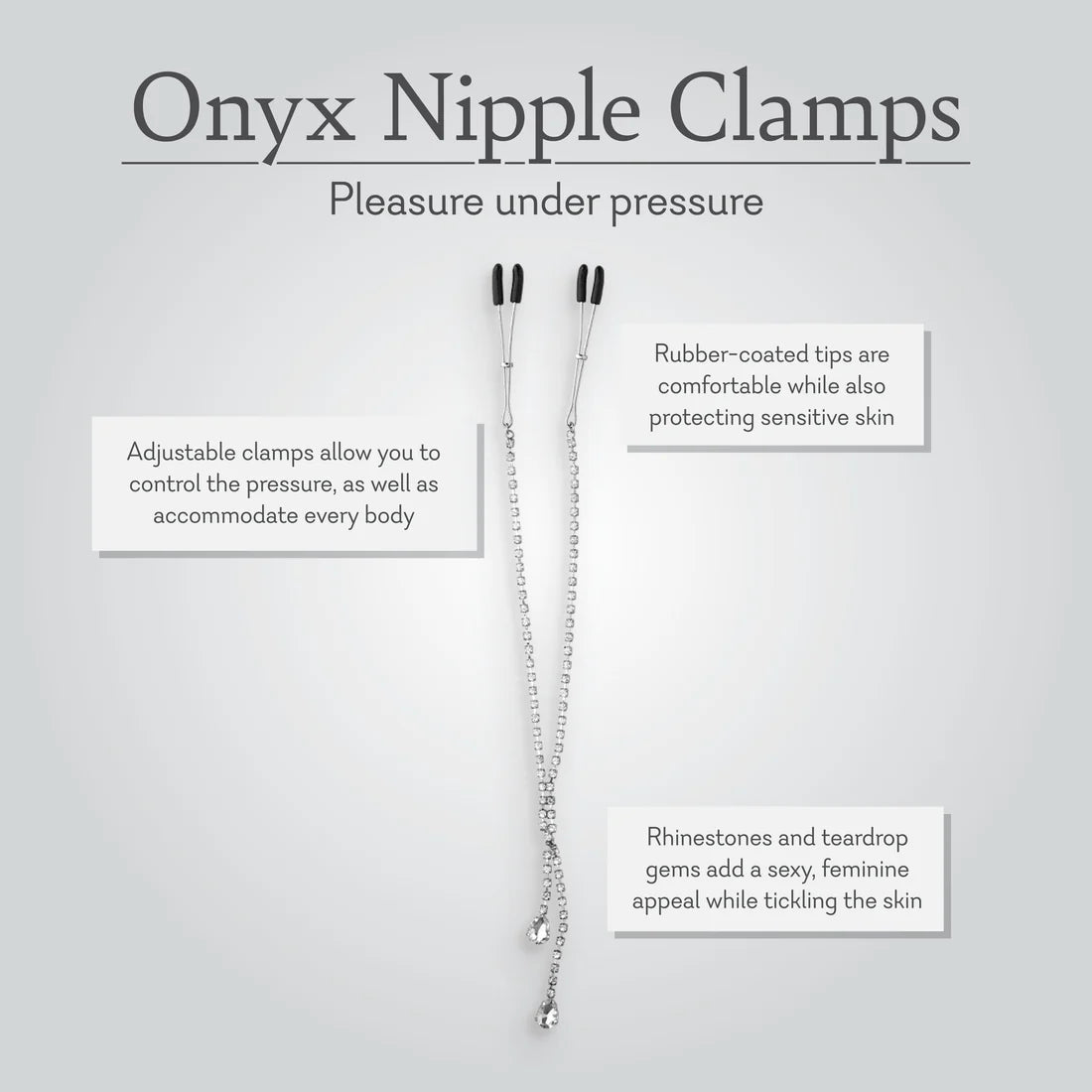 Estas pinzas para pezones adornadas con joyas de la colección Onyx son tan eróticas como brillantes y excitan los pezones con una presión sensual y sexy. Diseñadas para ajustarse a tus deseos, las pinzas están decoradas con diamantes de imitación y dos gemas en forma de lágrima que cuelgan hermosamente entre los senos desnudos.